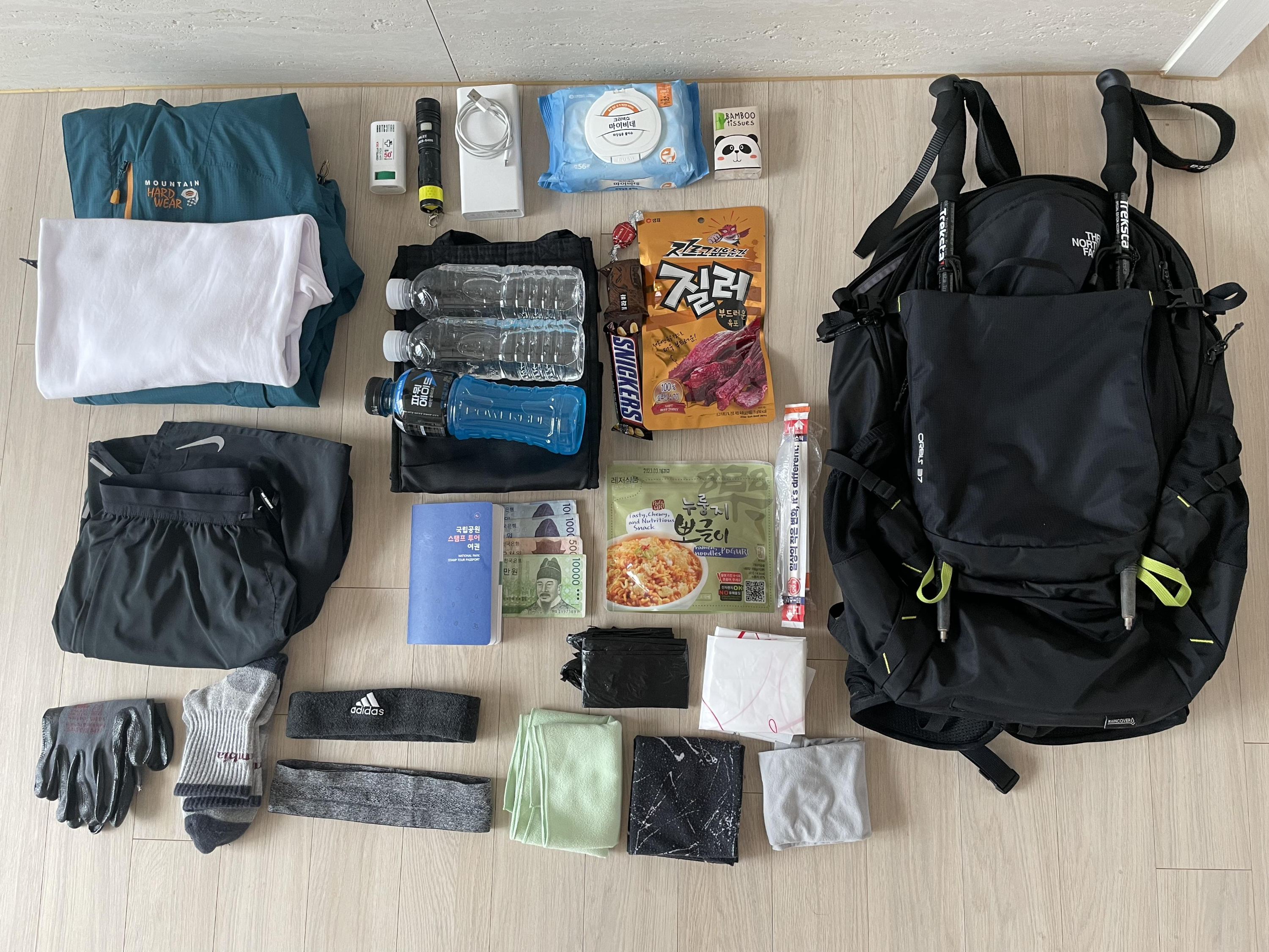- 기타 : 보조배터리 20000ma, 선크림, 물티슈, 휴대용 휴지, 국립공원 스템프투어 수첩, 현금 조금, 쓰레기와 젖은 의류 담을 비닐봉투2개