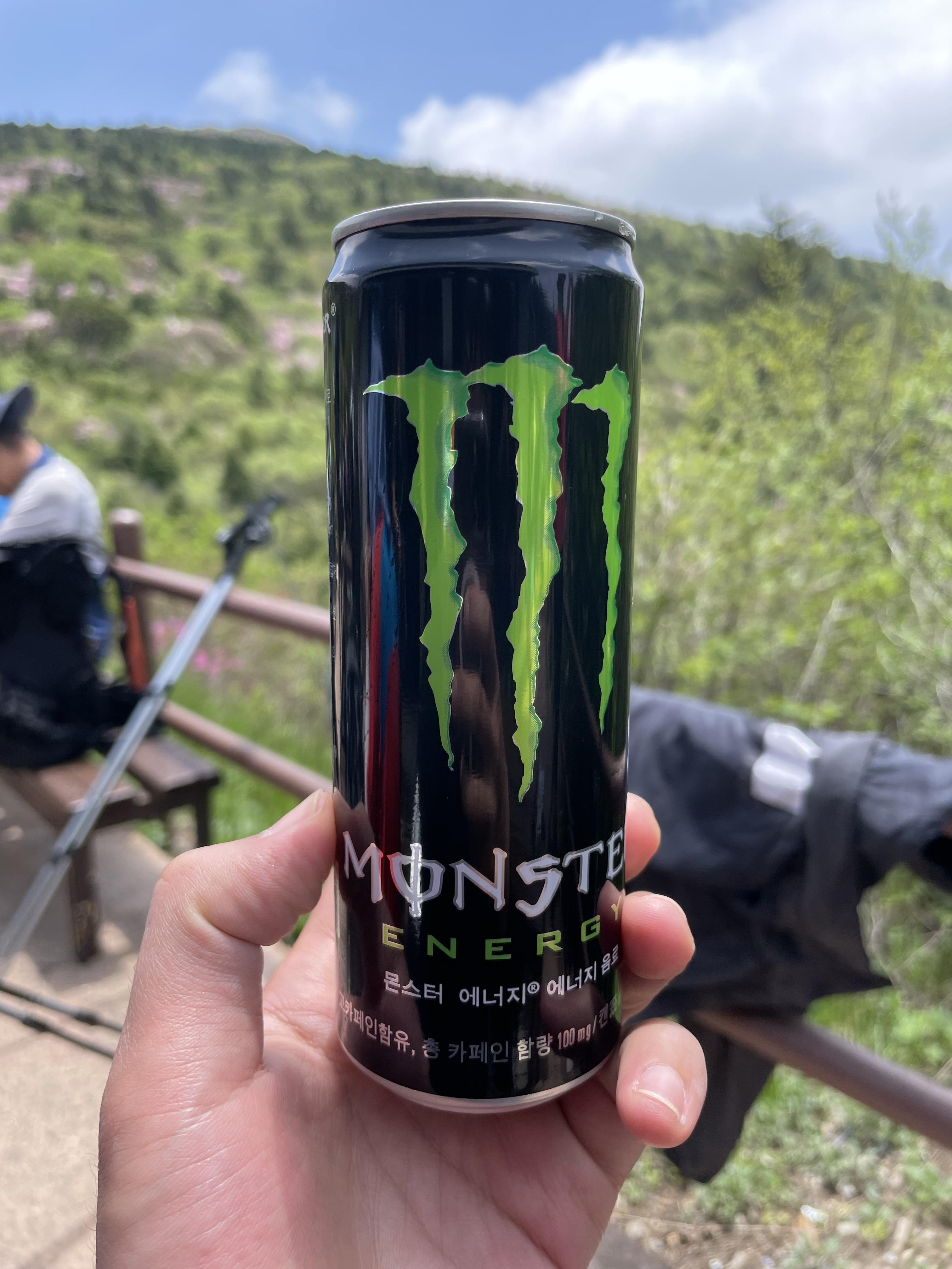 가방 밑에 얼음물과 함께 온 몬스터로 카페인 충전 든든히 하고